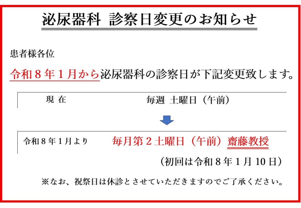 令和8年1月より泌尿器科の診察日が下記の通り変更致します。