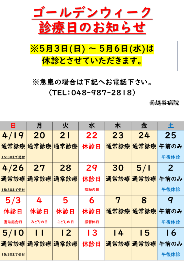ゴールデンウィーク 休診のお知らせ(4/29、5/3~5/6 休診)