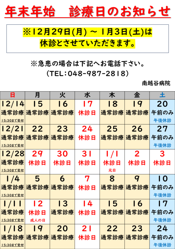 12月29日(月) ~ 1月3日(土)は、休診とさせていただきます。