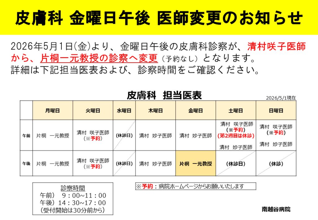 【皮膚科】 5月1日より毎週金曜日午後 片桐教授が診察いたします